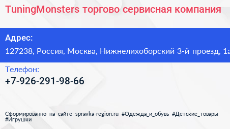 TuningMonsters, торгово-сервисная компания по адресу 127238, Россия, Москва, Нижнелихоборский 3-й проезд, 1а в дальнейшем Организация, размещена в следующих категориях: