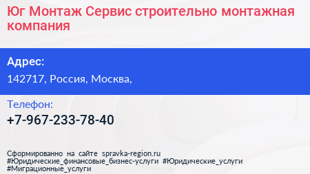 Юг Монтаж Сервис, строительно-монтажная компания по адресу 142717, Россия, Москва, в дальнейшем Организация, размещена в следующих категориях: