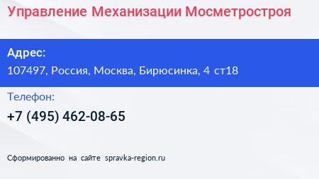 Управление Механизации Мосметростроя по адресу 107497, Россия, Москва, Бирюсинка, 4 ст18 в дальнейшем Организация, размещена в следующих категориях: