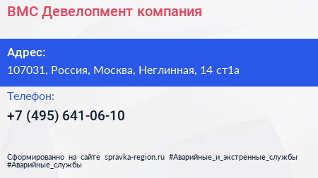 ВМС Девелопмент, компания по адресу 107031, Россия, Москва, Неглинная, 14 ст1а в дальнейшем Организация, размещена в следующих категориях: