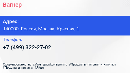 Вагнер по адресу 140000, Россия, Москва, Красная, 1 в дальнейшем Организация, размещена в следующих категориях: