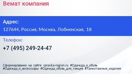 Вемат, компания по адресу 127644, Россия, Москва, Лобненская, 18 в дальнейшем Организация, размещена в следующих категориях: