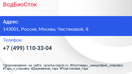 ВодБиоСток по адресу 143001, Россия, Москва, Чистяковой, 8 в дальнейшем Организация, размещена в следующих категориях: