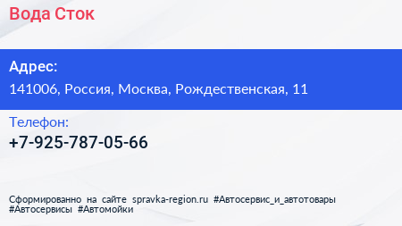 Вода Сток по адресу 141006, Россия, Москва, Рождественская, 11 в дальнейшем Организация, размещена в следующих категориях: