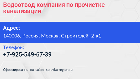 Водоотвод, компания по прочистке канализации по адресу 140006, Россия, Москва, Строителей, 2 к1 в дальнейшем Организация, размещена в следующих категориях: