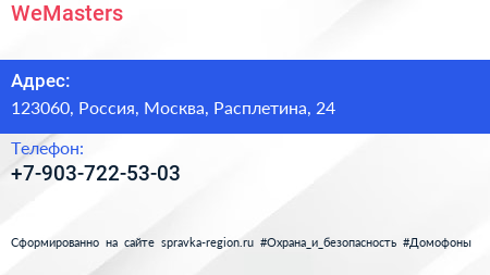 WeMasters по адресу 123060, Россия, Москва, Расплетина, 24 в дальнейшем Организация, размещена в следующих категориях: