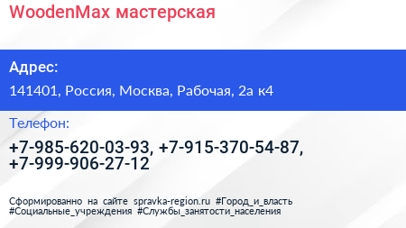 WoodenMax, мастерская по адресу 141401, Россия, Москва, Рабочая, 2а к4 в дальнейшем Организация, размещена в следующих категориях: