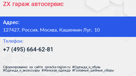 ZX гараж, автосервис по адресу 127427, Россия, Москва, Кашенкин Луг, 10 в дальнейшем Организация, размещена в следующих категориях: