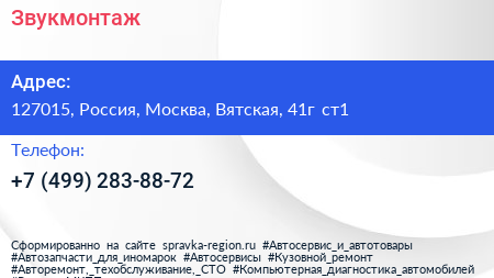 Звукмонтаж по адресу 127015, Россия, Москва, Вятская, 41г ст1 в дальнейшем Организация, размещена в следующих категориях: