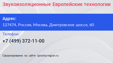 Звукоизоляционные Европейские технологии по адресу 127474, Россия, Москва, Дмитровское шоссе, 60 в дальнейшем Организация, размещена в следующих категориях: