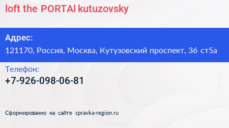 loft the PORTAl kutuzovsky по адресу 121170, Россия, Москва, Кутузовский проспект, 36 ст5а в дальнейшем Организация, размещена в следующих категориях: