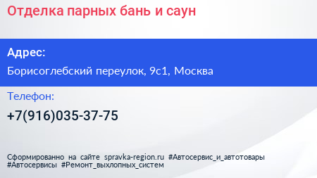 Отделка парных бань и саун по адресу Борисоглебский переулок, 9с1, Москва в дальнейшем Организация, размещена в следующих категориях: