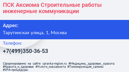 ПСК Аксиома Строительные работы, инженерные коммуникации по адресу Тарутинская улица, 1, Москва в дальнейшем Организация, размещена в следующих категориях: