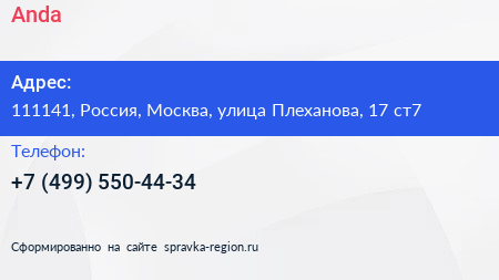 Anda по адресу 111141, Россия, Москва, улица Плеханова, 17 ст7 в дальнейшем Организация, размещена в следующих категориях:
