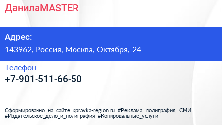 ДанилаMASTER по адресу 143962, Россия, Москва, Октября, 24 в дальнейшем Организация, размещена в следующих категориях: