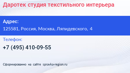 Даротек, студия текстильного интерьера по адресу 125581, Россия, Москва, Ляпидевского, 4 в дальнейшем Организация, размещена в следующих категориях: