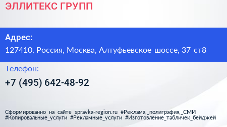 ЭЛЛИТЕКС ГРУПП по адресу 127410, Россия, Москва, Алтуфьевское шоссе, 37 ст8 в дальнейшем Организация, размещена в следующих категориях: