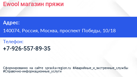 Ewool, магазин пряжи по адресу 140074, Россия, Москва, проспект Победы, 10/18 в дальнейшем Организация, размещена в следующих категориях: