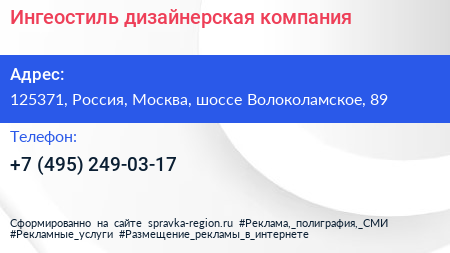 Ингеостиль, дизайнерская компания по адресу 125371, Россия, Москва, шоссе Волоколамское, 89 в дальнейшем Организация, размещена в следующих категориях: