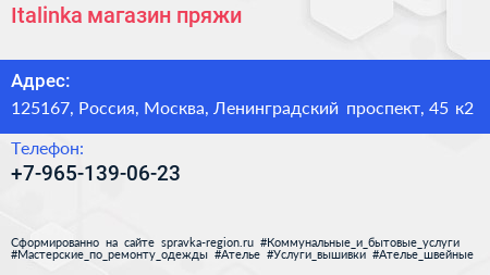 Italinka, магазин пряжи по адресу 125167, Россия, Москва, Ленинградский проспект, 45 к2 в дальнейшем Организация, размещена в следующих категориях: