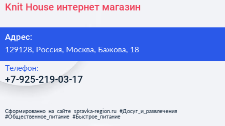 Knit House, интернет-магазин по адресу 129128, Россия, Москва, Бажова, 18 в дальнейшем Организация, размещена в следующих категориях: