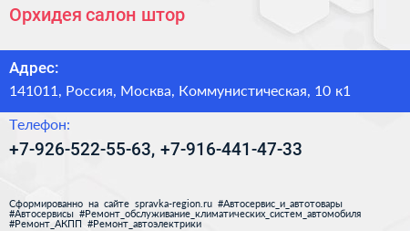 Орхидея, салон штор по адресу 141011, Россия, Москва, Коммунистическая, 10 к1 в дальнейшем Организация, размещена в следующих категориях: