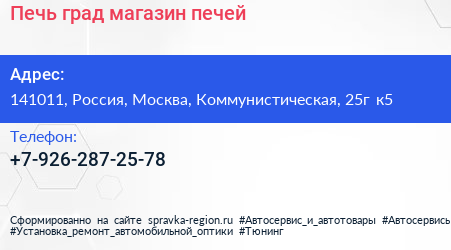 Печь-град, магазин печей по адресу 141011, Россия, Москва, Коммунистическая, 25г к5 в дальнейшем Организация, размещена в следующих категориях: