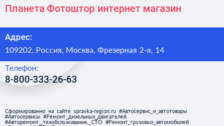 Планета Фотоштор, интернет-магазин по адресу 109202, Россия, Москва, Фрезерная 2-я, 14 в дальнейшем Организация, размещена в следующих категориях: