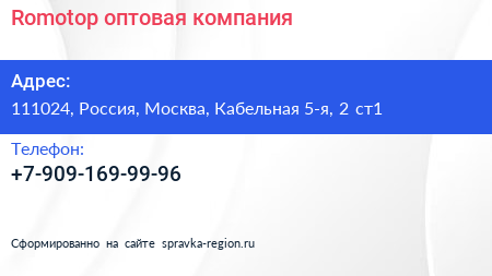 Romotop, оптовая компания по адресу 111024, Россия, Москва, Кабельная 5-я, 2 ст1 в дальнейшем Организация, размещена в следующих категориях: