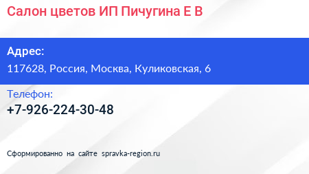 Салон цветов, ИП Пичугина Е.В. по адресу 117628, Россия, Москва, Куликовская, 6 в дальнейшем Организация, размещена в следующих категориях: