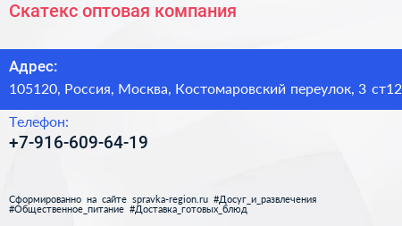 Скатекс, оптовая компания по адресу 105120, Россия, Москва, Костомаровский переулок, 3 ст12 в дальнейшем Организация, размещена в следующих категориях: