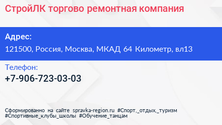 СтройЛК, торгово-ремонтная компания по адресу 121500, Россия, Москва, МКАД 64 Километр, вл13 в дальнейшем Организация, размещена в следующих категориях: