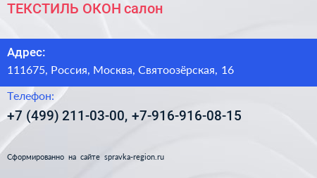 ТЕКСТИЛЬ ОКОН, салон по адресу 111675, Россия, Москва, Святоозёрская, 16 в дальнейшем Организация, размещена в следующих категориях: