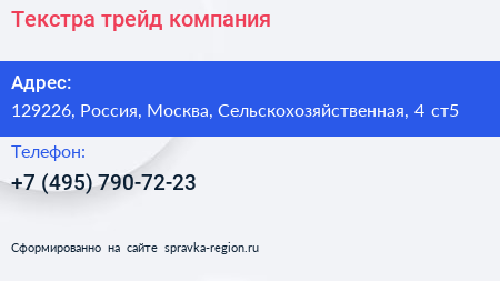 Текстра трейд, компания по адресу 129226, Россия, Москва, Сельскохозяйственная, 4 ст5 в дальнейшем Организация, размещена в следующих категориях: