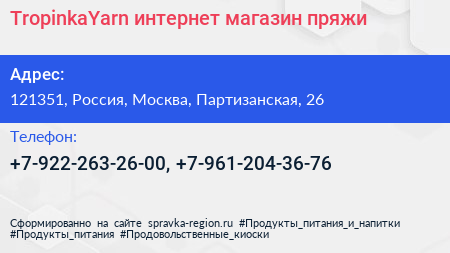 TropinkaYarn, интернет-магазин пряжи по адресу 121351, Россия, Москва, Партизанская, 26 в дальнейшем Организация, размещена в следующих категориях: