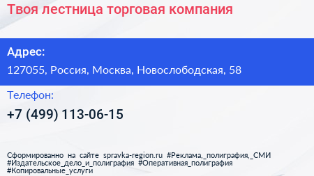 Твоя лестница, торговая компания по адресу 127055, Россия, Москва, Новослободская, 58 в дальнейшем Организация, размещена в следующих категориях: