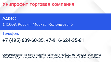 Унипрофит, торговая компания по адресу 141009, Россия, Москва, Колонцова, 5 в дальнейшем Организация, размещена в следующих категориях: