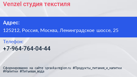 Venzel, студия текстиля по адресу 125212, Россия, Москва, Ленинградское шоссе, 25 в дальнейшем Организация, размещена в следующих категориях: