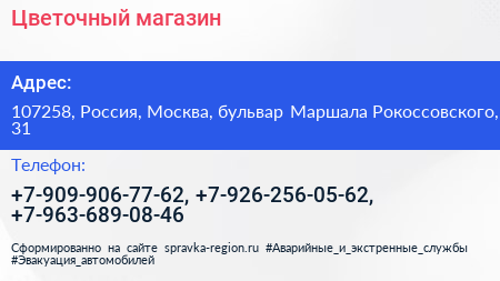 Цветочный магазин по адресу 107258, Россия, Москва, бульвар Маршала Рокоссовского, 31 в дальнейшем Организация, размещена в следующих категориях: