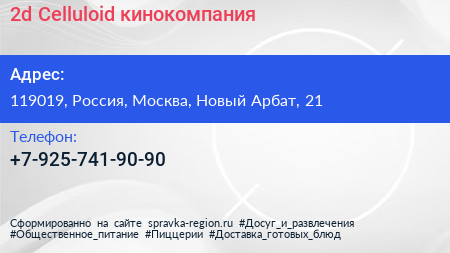 2d Celluloid, кинокомпания по адресу 119019, Россия, Москва, Новый Арбат, 21 в дальнейшем Организация, размещена в следующих категориях: