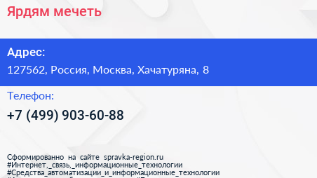 Ярдям, мечеть по адресу 127562, Россия, Москва, Хачатуряна, 8 в дальнейшем Организация, размещена в следующих категориях:
