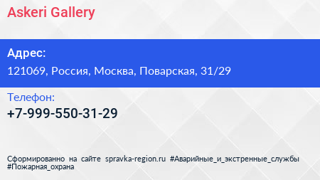 Askeri Gallery по адресу 121069, Россия, Москва, Поварская, 31/29 в дальнейшем Организация, размещена в следующих категориях: