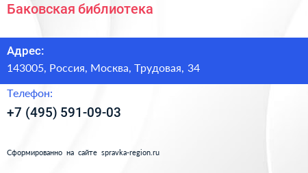 Баковская библиотека по адресу 143005, Россия, Москва, Трудовая, 34 в дальнейшем Организация, размещена в следующих категориях:
