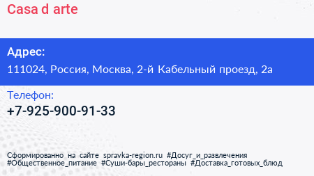 Casa d`arte по адресу 111024, Россия, Москва, 2-й Кабельный проезд, 2а в дальнейшем Организация, размещена в следующих категориях: