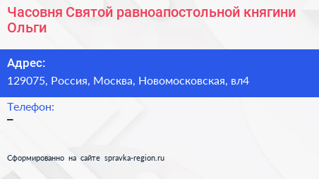 Часовня Святой равноапостольной княгини Ольги по адресу 129075, Россия, Москва, Новомосковская, вл4 в дальнейшем Организация, размещена в следующих категориях: