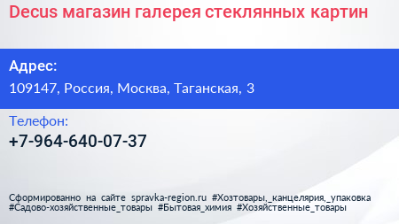 Decus, магазин-галерея стеклянных картин по адресу 109147, Россия, Москва, Таганская, 3 в дальнейшем Организация, размещена в следующих категориях: