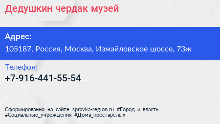 Дедушкин чердак, музей по адресу 105187, Россия, Москва, Измайловское шоссе, 73ж в дальнейшем Организация, размещена в следующих категориях: