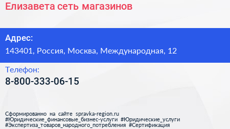 Елизавета, сеть магазинов по адресу 143401, Россия, Москва, Международная, 12 в дальнейшем Организация, размещена в следующих категориях: