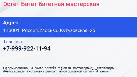 Эстет Багет, багетная мастерская по адресу 143001, Россия, Москва, Кутузовская, 25 в дальнейшем Организация, размещена в следующих категориях: