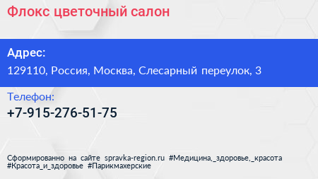 Флокс, цветочный салон по адресу 129110, Россия, Москва, Слесарный переулок, 3 в дальнейшем Организация, размещена в следующих категориях: